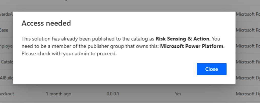 Kuka tahansa tekijä, jolla on Luettelon lähettäjä -rooli jossakin ympäristössä, voi julkaista sen. Ratkaisun julkaisemisen jälkeen tekijän on kuitenkin kuuluttava julkaisuryhmään, jotta hän voi julkaista saman ratkaisun uudelleen. Tämä virhe ilmenee, jos käyttöoikeutta ei ole. Voit pyytää sitä järjestelmänvalvojalta.