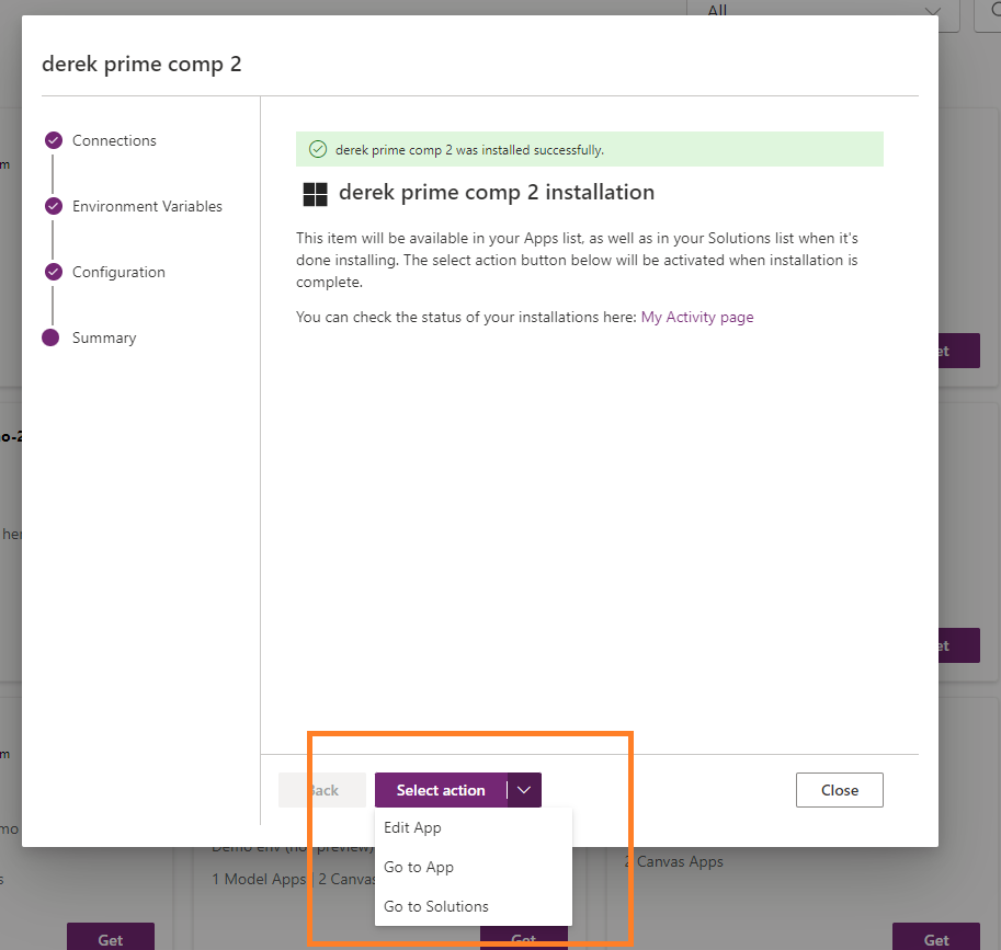 Kun pääset viimeiseen vaiheeseen, yhteenvetonäyttöön, odotat, että luettelokohde asennetaan ympäristöösi. Monimutkaisuuden mukaan asennus voi kestää alle minuutista useaan minuuttiin. Kun olet valmis, avattavassa luettelossa on useita vaihtoehtoja sen mukaan, mitä luettelokohteessa on ja onko tekijä määrittänyt ensisijaisen osan. Seuraavassa esimerkissä peruspohjasovellus on luettelokohteen ensisijainen osa:
