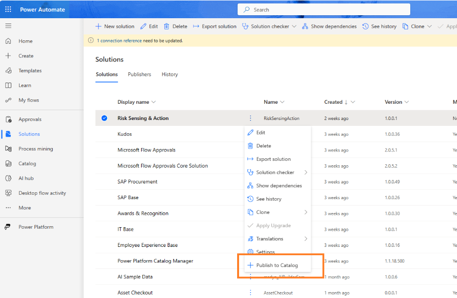 Siirry ratkaisusivulle, ja kaikissa hallitsemattomissa ratkaisuissa on uusi vaihtoehto Julkaise luetteloon (ratkaisun näyttönimen vieressä kolme pystysuuntaista pistettä). Tämä asetus ei ole käytettävissä, jos henkilöllä ei ole Luettelon lähettäjä -roolia.
