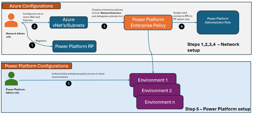 Seuraavassa kaaviossa näytetään roolien toiminnot Power Platform -ympäristön näennäisverkon tuen määritysprosessissa.