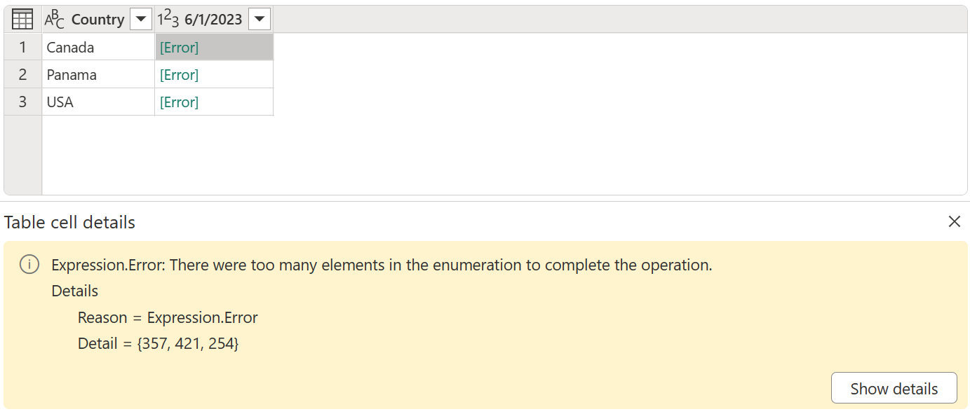 Huomaa virheilmoitus Expression.Error: There were too many elements in the enumeration to complete the operation. Tämä virhe johtuu siitä, että Don't aggregate -operaatio odottaa vain yhtä arvoa maan ja päivämäärän yhdistelmälle.