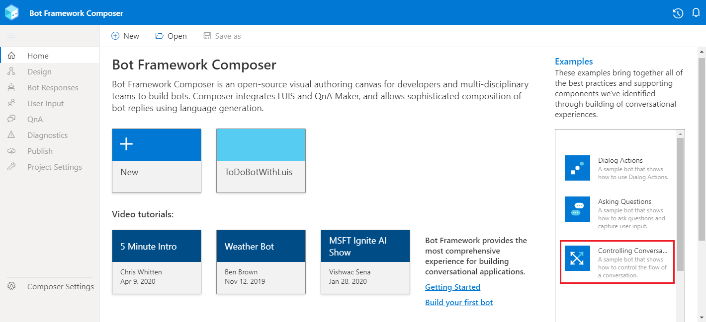 Do the following to get the Controlling Conversation Flow example running in Composer: