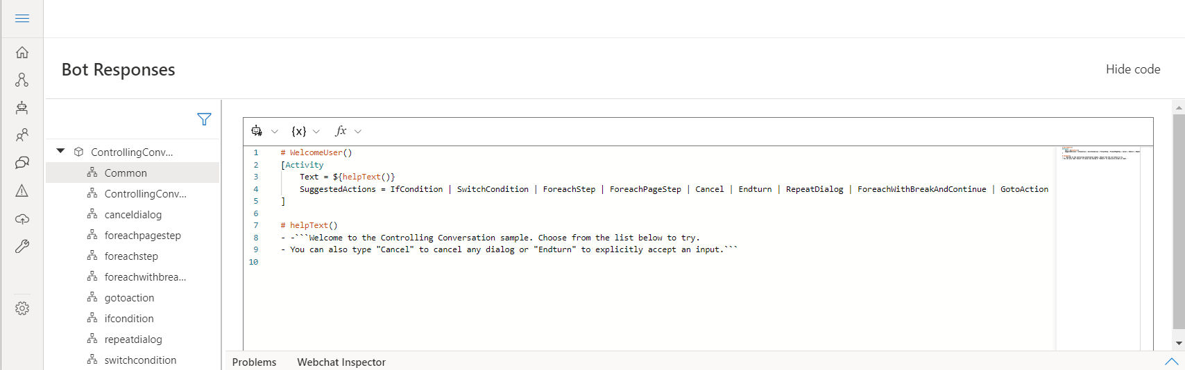 ControllingConversationFlowSampleproject that you can open in Composer. Open the bot to load it.After you load it in Composer, you can click Start Bot and then Open in Web Chat to explore the sample interactively.