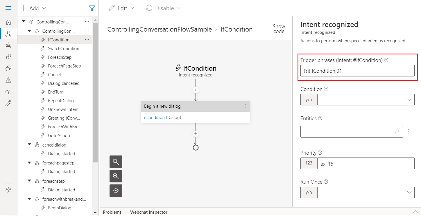 SuggestedActions. When the user selects one of them, the bot sends an event with the corresponding intent. That intent is captured by the Intent recognized trigger created to handle that intent. For example, if the user enters IfCondition the ifCondition trigger handles that event and calls the IfCondition dialog. The remaining steps in this section will walk you through this process.Select the main dialog and look at the properties pane. By default, the Recognizer/Dispatch type is set to the Regular expression recognizer.