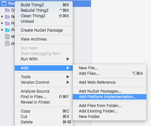 If an existing PCL project or .NET Standard project needs to be expanded to include platform-specific code, this can be done by right-clicking on the project and selecting Add > Add Platform Implementation...: