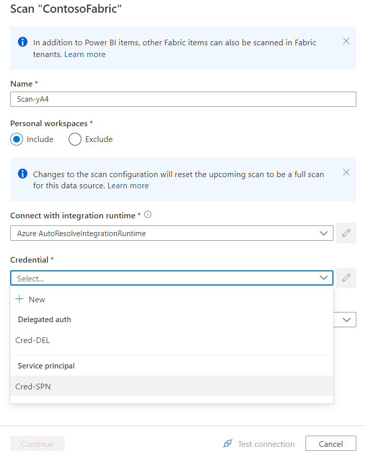 If you switch the configuration of a scan to include or exclude a personal workspace, you trigger a full scan of the Fabric source.