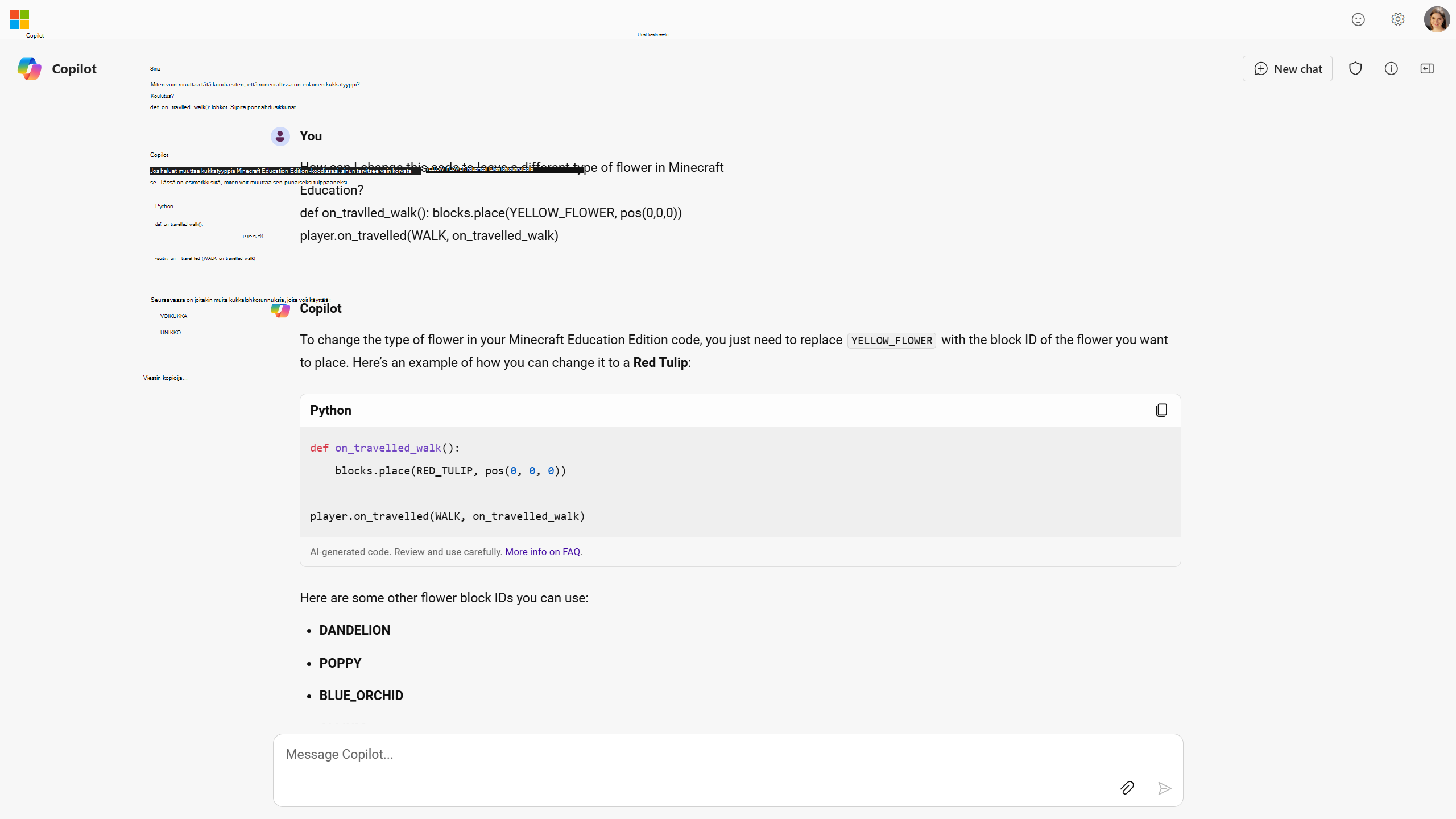 Minecraft Education -koodauskysymyksen helppokäyttöisen tiedoston malli Copilot Chat vastaus