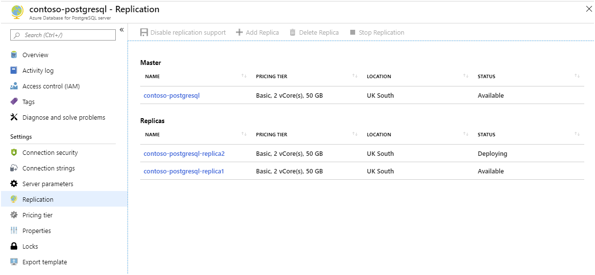 Replikaatio ei ole synkronista, ja kaikki muutokset, jotka tehdään pääpalvelimen dataan, voivat kestää jonkin aikaa ennen kuin ne näkyvät replikoissa. Asiakassovellusten, jotka muodostavat yhteyden replikoihin, on pystyttävä selviytymään tästä mahdollisesta yhtenäisyyden tasosta. Azure Monitorin avulla voit seurata aikaviivettä replikoinnissa käyttämällä enimmäisviivettä replikoinnissa ja Replica Lag -mittareissa.