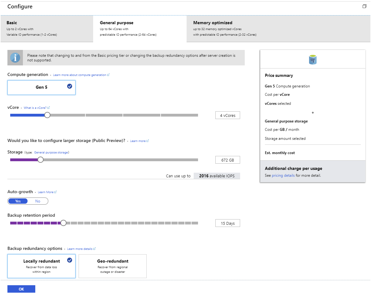 Hinnoittelutaso ja siihen varatut käsittelyresurssit määrittävät palvelun tukemien samanaikaisten yhteyksien enimmäismäärän. Jos valitset esimerkiksi Yleiskäyttö-hinnoittelutason ja varaat 64 virtuaaliydintä, palvelu tukee 1900 samanaikaista yhteyttä. Perustaso, jossa on kaksi virtuaaliydintä, käsittelee jopa 100 samanaikaista yhteyttä. Azure itse vaatii viisi näistä yhteyksistä palvelimen valvontaan. Jos ylität käytettävissä olevien yhteyksien määrän, asiakkaat saavat virheen FATAL: anteeksi, liian moni asiakasjo .