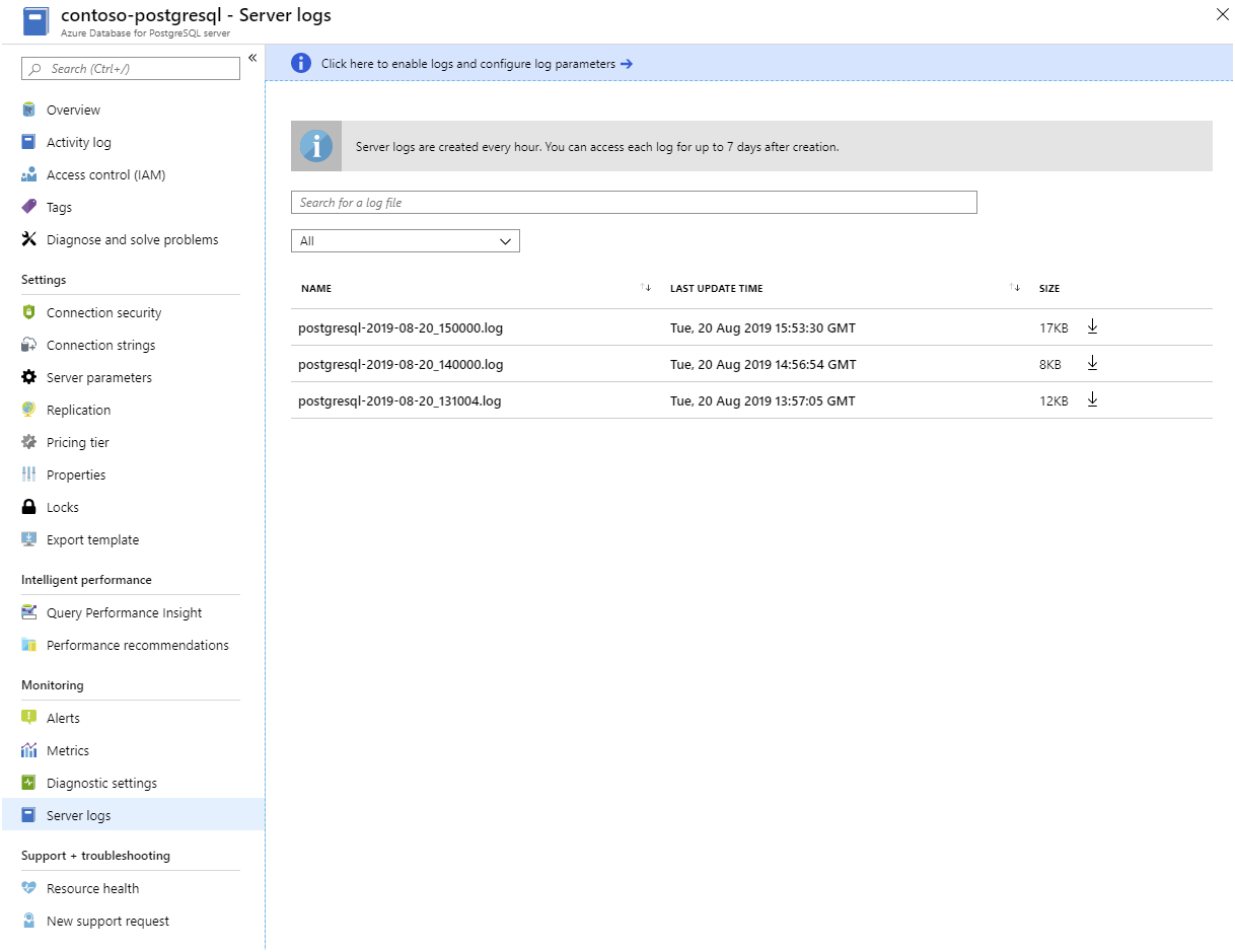 Palvelimen lokit. Azure tuo lokit käytettäväksi kullekin PostgreSQL-palvelimelle. Voit ladata ne Azure-portaalista: