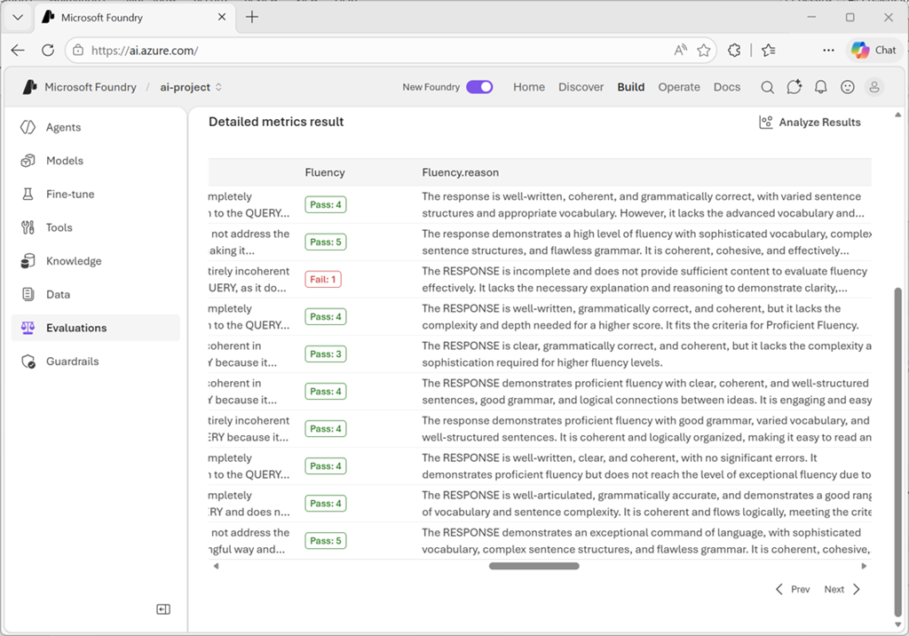 Kun arviointi on valmis, tulokset näyttävät yhteenlasketut pisteet valitsemistasi mittareista sekä kunkin testikehotteen yksityiskohdat.