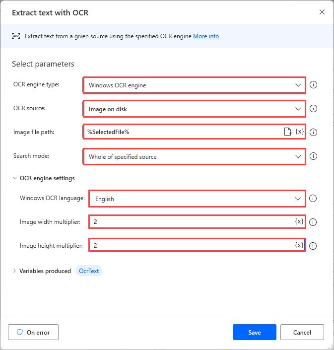 Add an Extract text with OCR action to the workspace and configure it to extract text from the previously selected image. In the OCR engine settings, set the image width and height multipliers to 2.