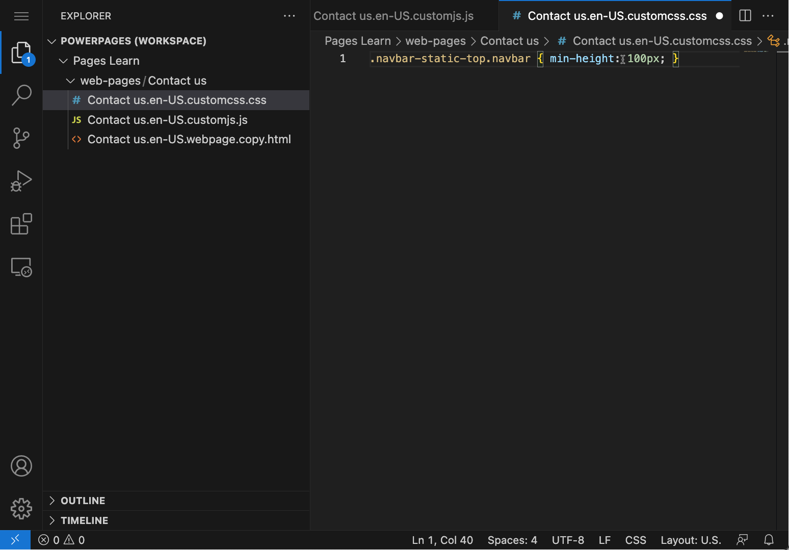 You can change the style of your website pages by applying CSS statements directly to a page. When you edit the page content by using Visual Studio Code, you can add CSS as a separate file. You include that file as part of the page content, and CSS applies to that page. For example, if you need to increase the height of the upper navigation bar on a home page to fit a logo, you can edit the CSS file and then add a custom CSS statement.
