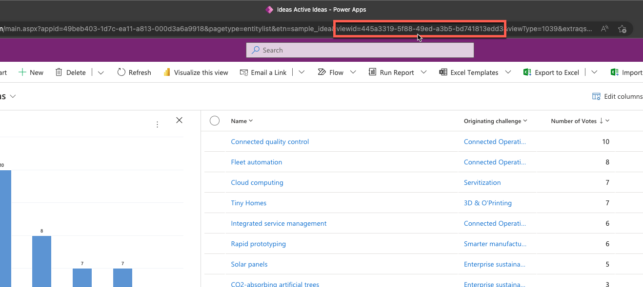 id- Visualization identifier of the chart. You can get this parameter by exporting the chart.viewid- Table view identifier when it's opened in the model-driven view editor. If it's not specified, the default view is used.