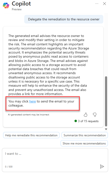 Kun ymmärrät suosituksen paremmin, voit päättää, miten sitä käsitellään parhaiten. Voit esimerkiksi valita, että Copilot auttaa korjaamaan suosituksen, delegoimaan korjaamisen resurssin omistajalle tai antamaan muita kehotteita tarpeen mukaan.