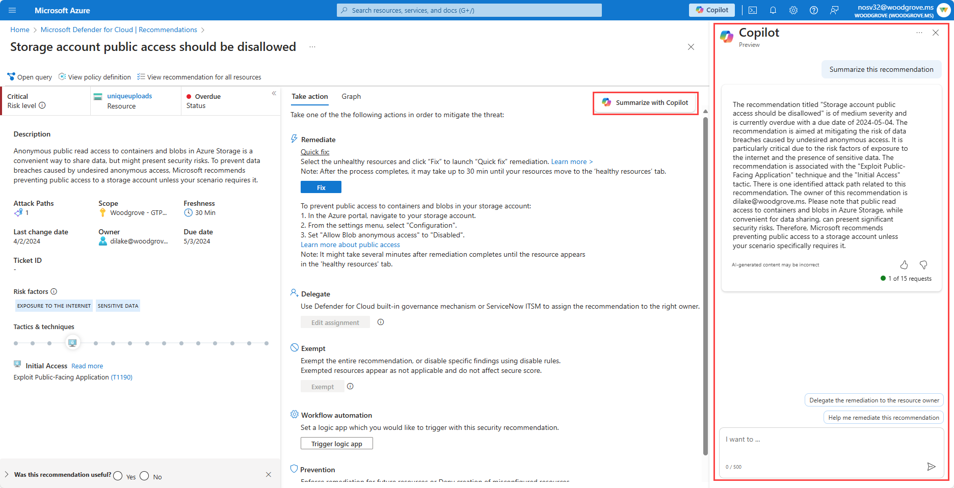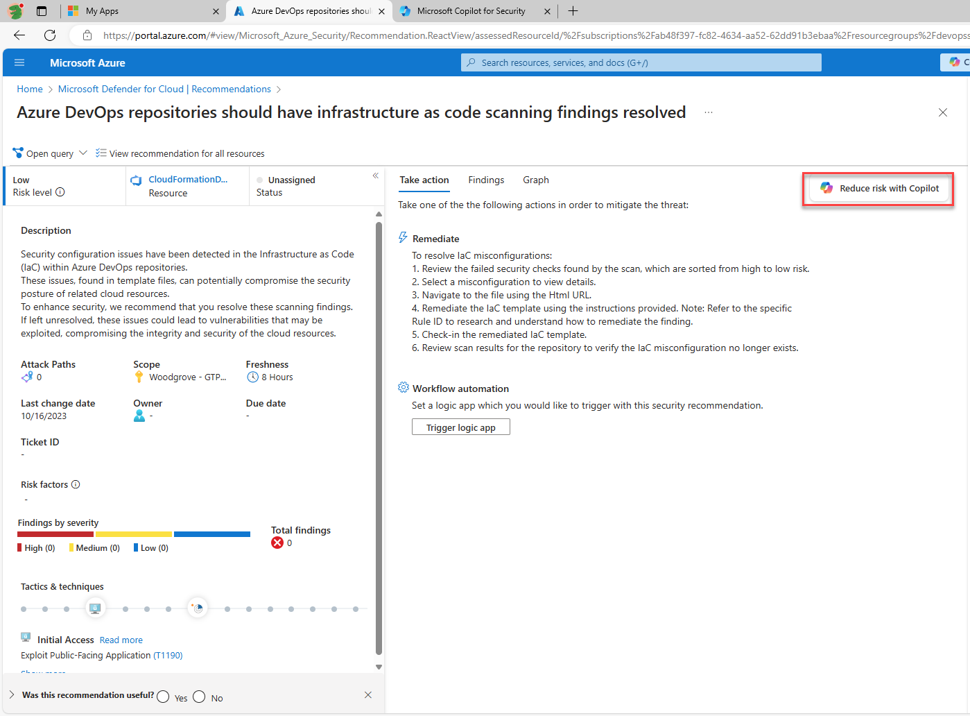 Copilotin käyttö Defender for Cloudissa auttaa suositusten korjausprosessissa: