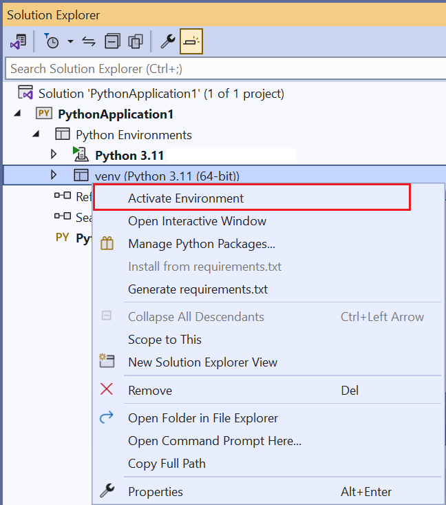 To change the active environment, right-click the desired environment in Solution Explorer and select Activate Environment as shown in the following image. For more information, see Select an environment for a project.