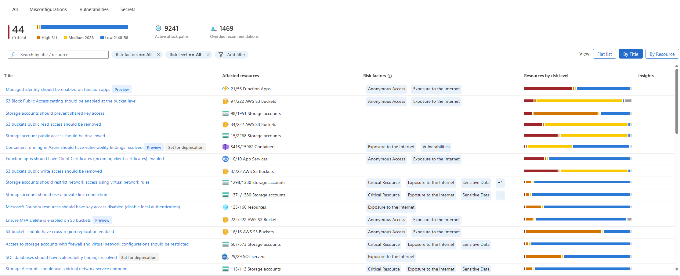 This view aggregates recommendations by title, showing a consolidated list ordered by risk level. Each row represents all instances of a particular recommendation across your environment.