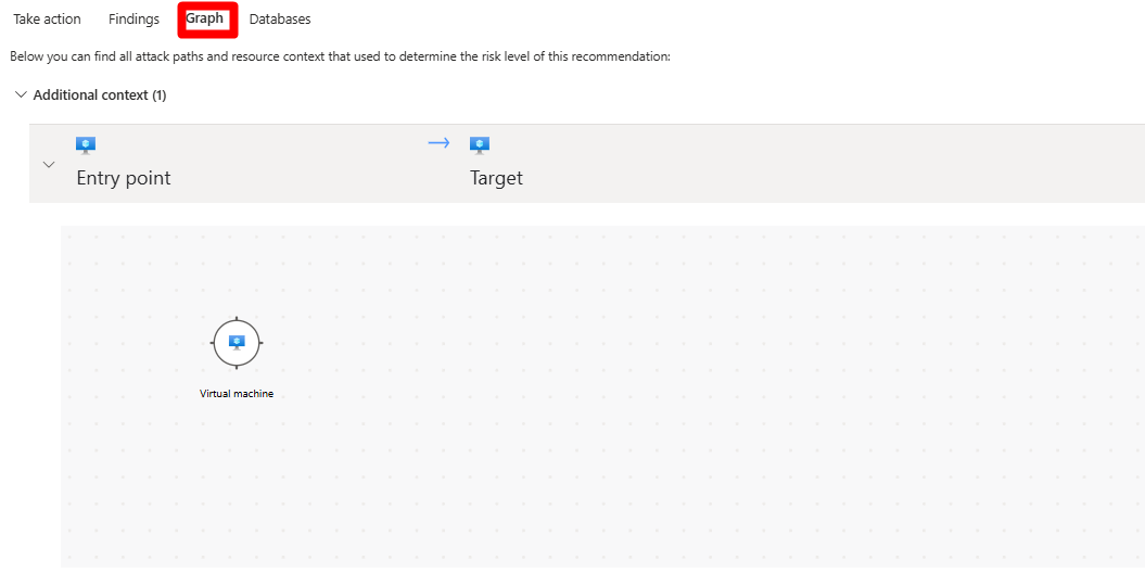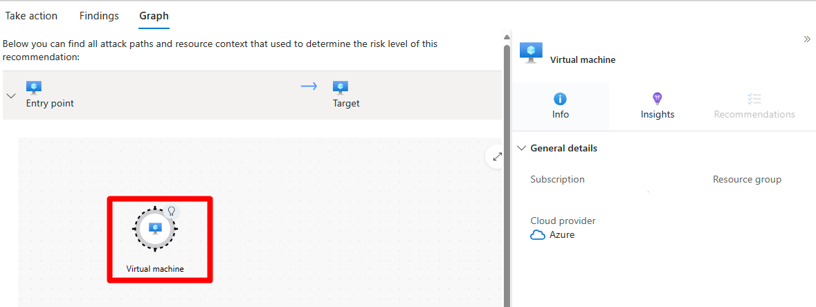 In Graph, view and investigate all the context that's used for risk prioritization, including attack paths. You can select a node in an attack path to view the details of the selected node.