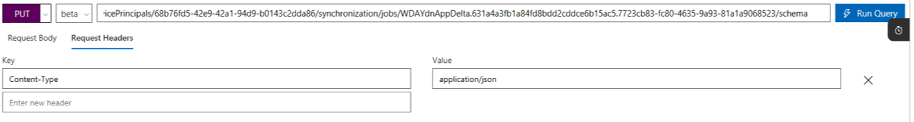 In the Microsoft Graph Explorer, configure the following PUT query, replacing [servicePrincipalId] and [ProvisioningJobId] with the ServicePrincipalId and the ProvisioningJobId retrieved in the previous steps.