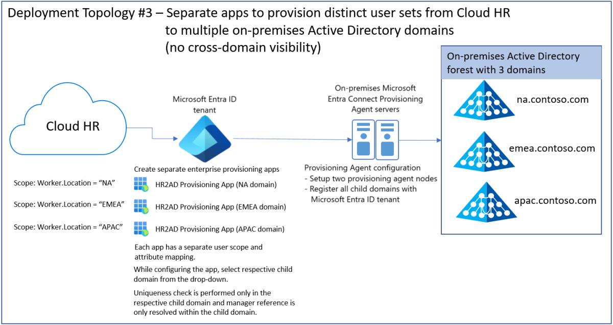 The Microsoft Entra Connect provisioning agent deployment topology depends on the number of cloud HR app tenants and Active Directory child domains that you plan to integrate. If you have multiple Active Directory domains, it depends on whether the Active Directory domains are contiguous or disjoint.