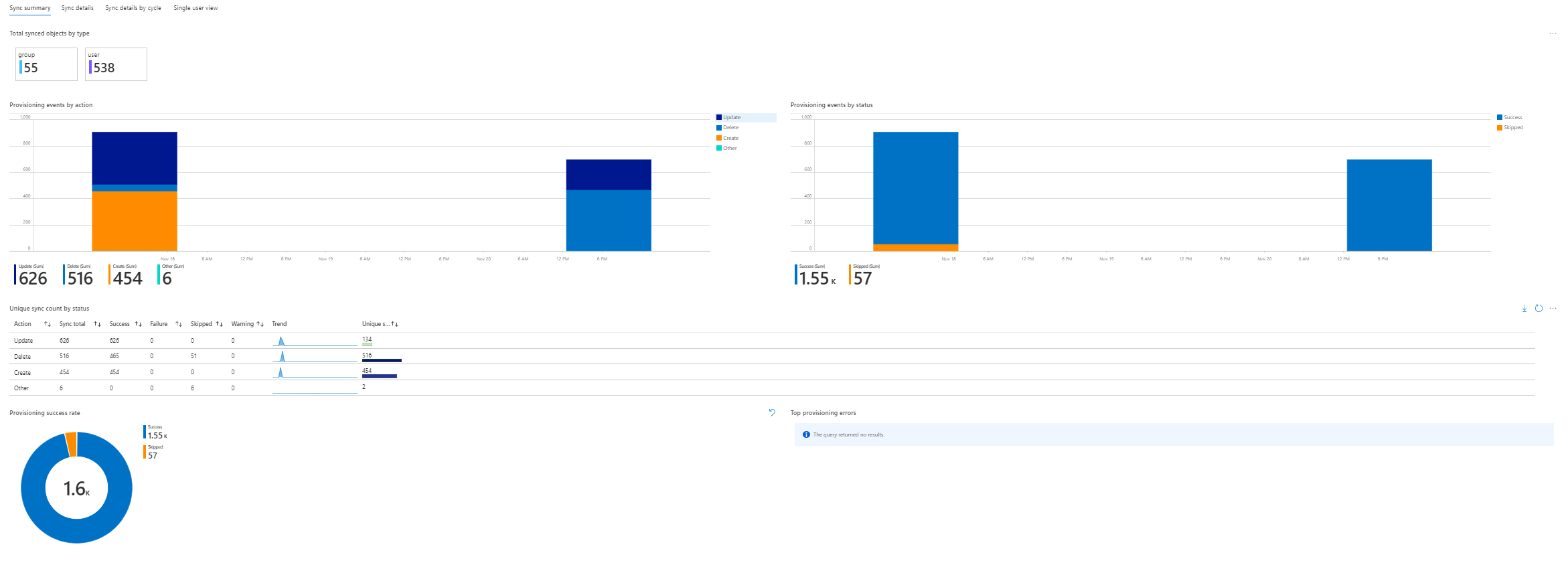 The Provisioning workbook provides a flexible canvas for data analysis. This workbook brings together all of the provisioning logs from various sources and allows you to gain insight, in a single area. The workbook allows you to create rich visual reports within the Azure portal. To learn more, see Microsoft Entra Workbooks overview.
