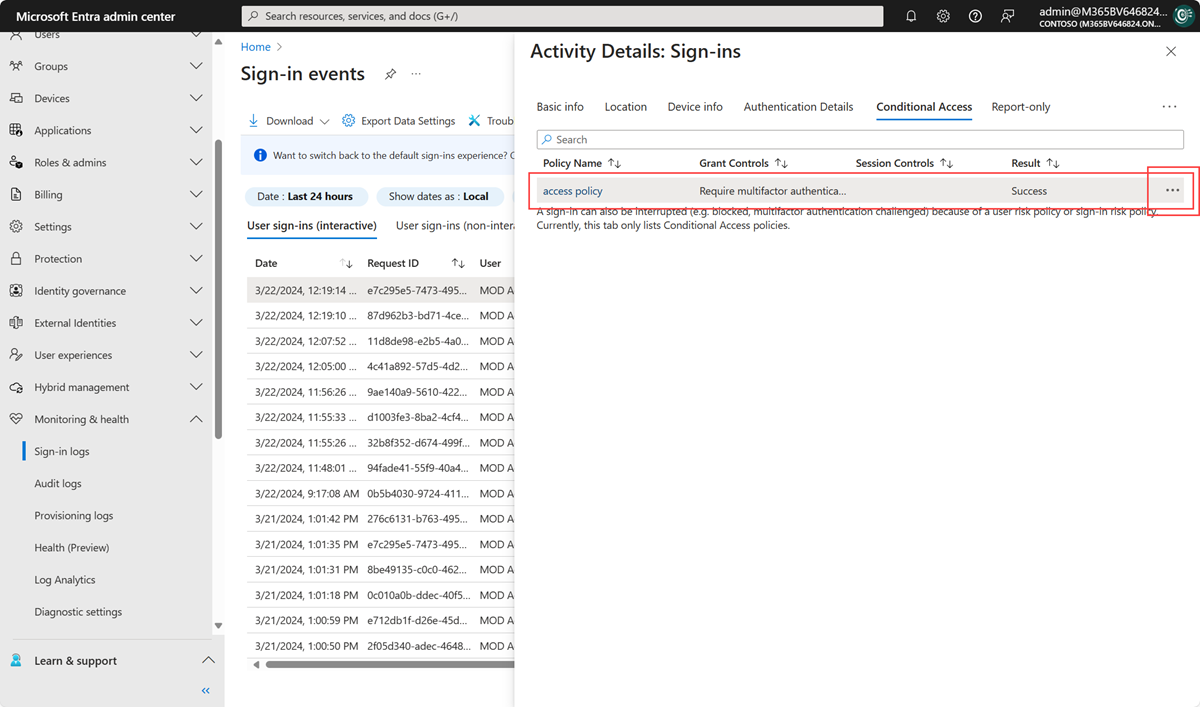 Select the ellipsis on the right side of the policy in a sign-in event to see policy details. This option gives admins more information about why a policy was applied or not.