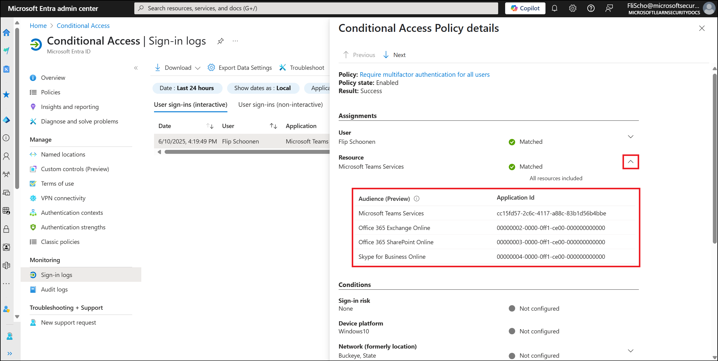 Admins find Audience in the sign-in logs after selecting a policy on the Conditional Access tab.