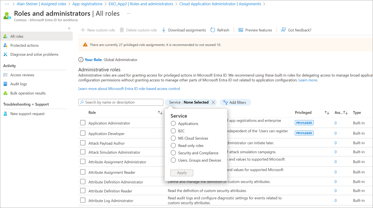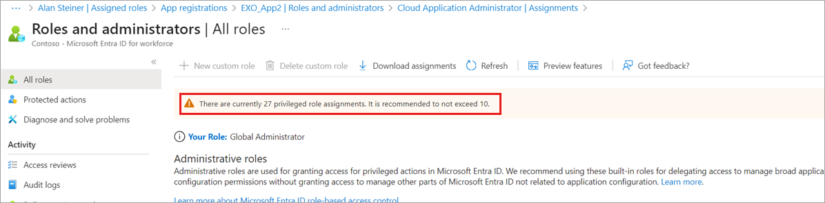 Some roles include privileged permissions, such as the ability to update credentials. Since these roles can potentially lead to elevation of privilege, you should limit the use of these privileged role assignments to fewer than 10 in your organization. If you exceed 10 privileged role assignments, a warning is displayed on the Roles and administrators page.