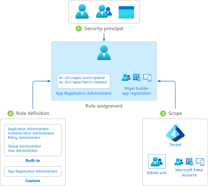The following diagram shows an example of a role assignment. In this example, Chris has been assigned the App Registration Administrator custom role at the scope of the Contoso Widget Builder app registration. The assignment grants Chris the permissions of the App Registration Administrator role for only this specific app registration.