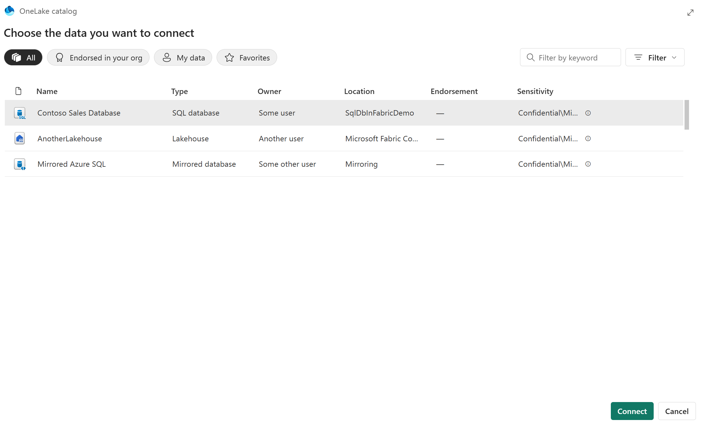 The list is filtered to include only supported data sources that your user account has access to. Data sources might be in other workspaces. If you can't find the data source you're looking for, make sure you have the right permissions to connect to it.