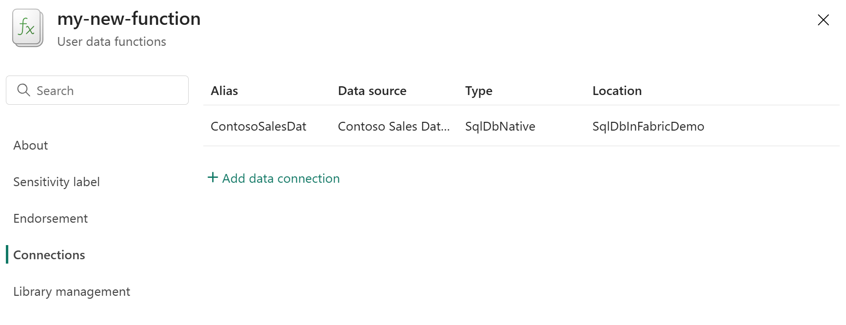 ContosoSalesDat, the decorator would look like this:@udf.connection(argName="sqlDB",alias="ContosoSalesDat") @udf.function() def read_from_sql_db(sqlDB: fn.FabricSqlConnection)-> list: [...]Test your function to verify the connection works correctly.