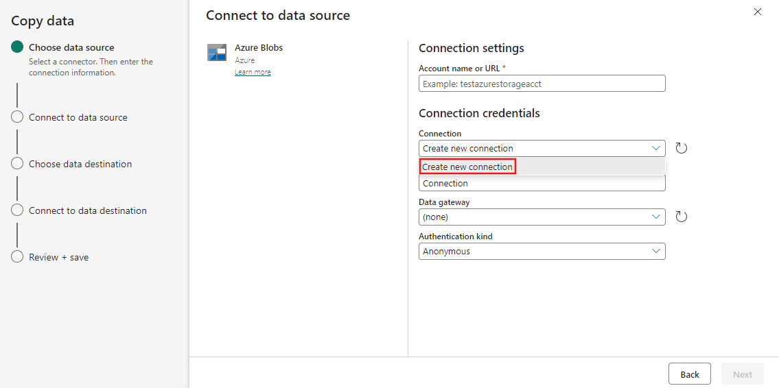 After you select Create new connection, fill in the required connection information and then select Next. For the details of connection creation for each type of data source, you can refer to each connector article.
