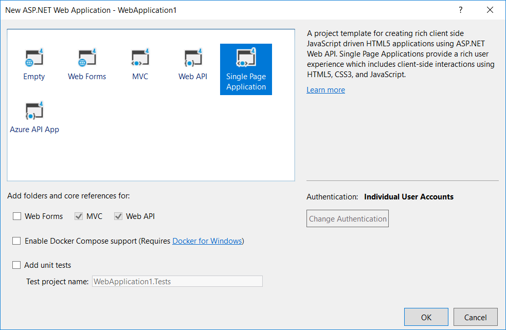 When the New ASP.NET Project is displayed, select the Single Page Application template and click Create Project.