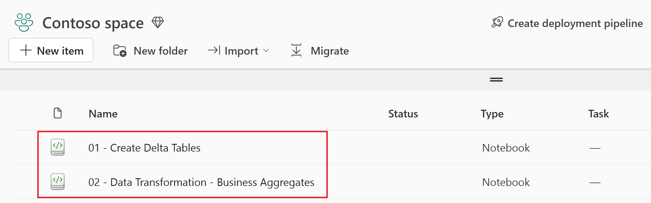 After the import is successful, go to the items view of the workspace to verify the newly imported notebooks.