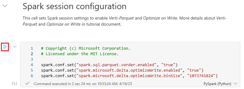 Cell 1 - Spark session configuration. As in the previous notebook, this cell enables V-order and Optimize Write for the Spark session.