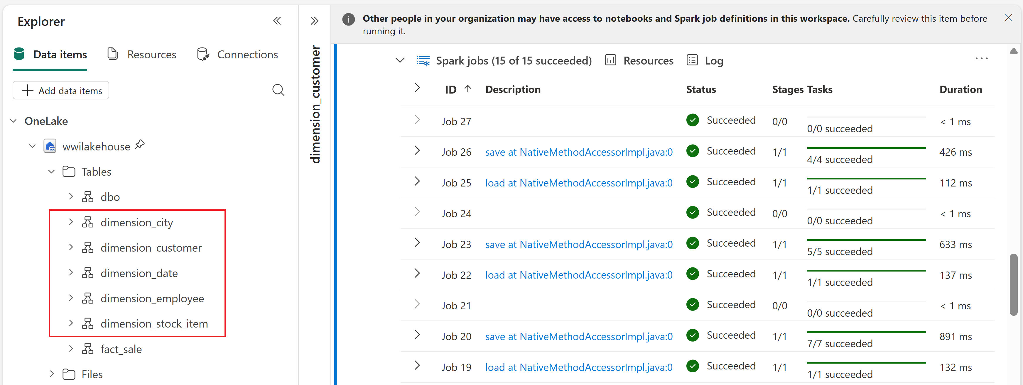 wwi-raw-datafolder for a given table name, drops the unusedPhotocolumn, and writes each table as a Delta table. It then loops through five dimension tables (dimension_city,dimension_customer,dimension_date,dimension_employee, anddimension_stock_item) and creates a Delta table for each one.Run this cell.