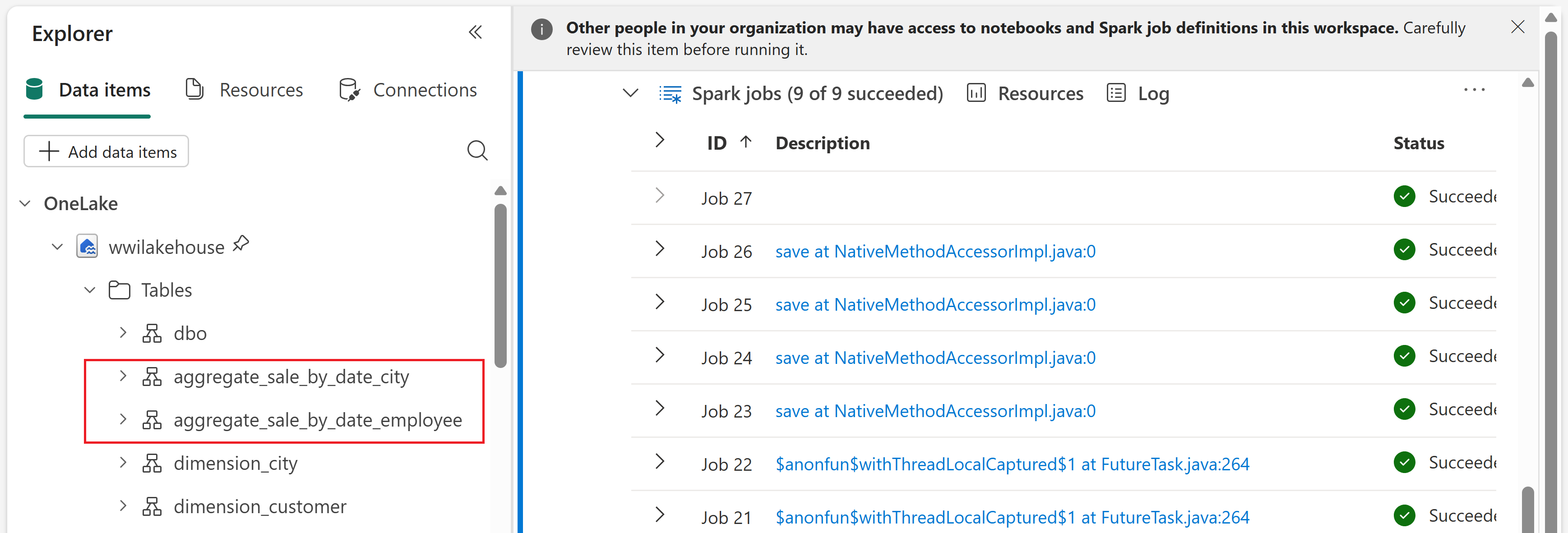 sale_by_date_city = df_fact_sale.alias("sale") \ .join(df_dimension_date.alias("date"), df_fact_sale.InvoiceDateKey == df_dimension_date.Date, "inner") \ .join(df_dimension_city.alias("city"), df_fact_sale.CityKey == df_dimension_city.CityKey, "inner") \ .select("date.Date", "date.CalendarMonthLabel", "date.Day", "date.ShortMonth", "date.CalendarYear", "city.City", "city.StateProvince", "city.SalesTerritory", "sale.TotalExcludingTax", "sale.TaxAmount", "sale.TotalIncludingTax", "sale.Profit")\ .groupBy("date.Date", "date.CalendarMonthLabel", "date.Day", "date.ShortMonth", "date.CalendarYear", "city.City", "city.StateProvince", "city.SalesTerritory")\ .sum("sale.TotalExcludingTax", "sale.TaxAmount", "sale.TotalIncludingTax", "sale.Profit")\ .withColumnRenamed("sum(TotalExcludingTax)", "SumOfTotalExcludingTax")\ .withColumnRenamed("sum(TaxAmount)", "SumOfTaxAmount")\ .withColumnRenamed("sum(TotalIncludingTax)", "SumOfTotalIncludingTax")\ .withColumnRenamed("sum(Profit)", "SumOfProfit")\ .orderBy("date.Date", "city.StateProvince", "city.City") sale_by_date_city.write.mode("overwrite").format("delta").option("overwriteSchema", "true").save("Tables/aggregate_sale_by_date_city")Cell 4 - Approach #2 - sale_by_date_employee. This cell uses Spark SQL to create a temporary view called