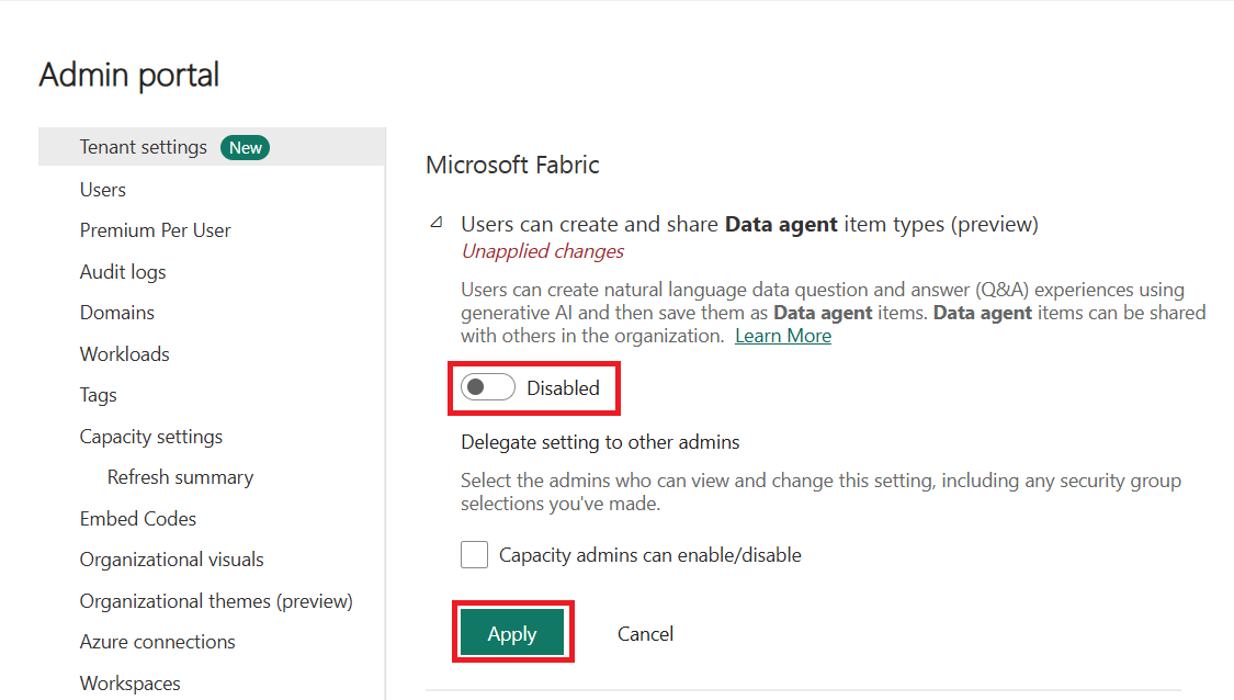 To prevent users from creating and sharing Fabric data agent items, administrators can disable this setting.