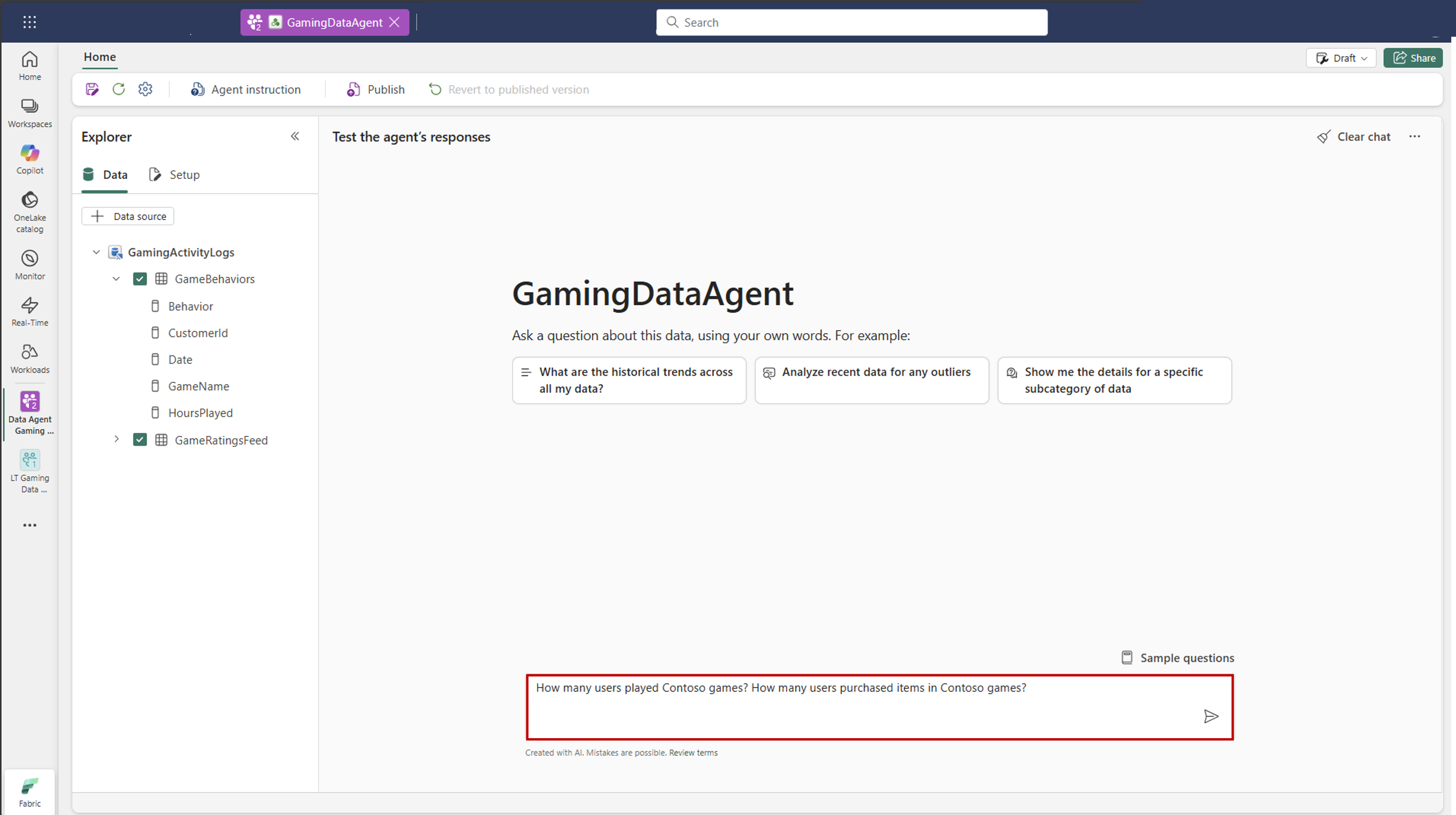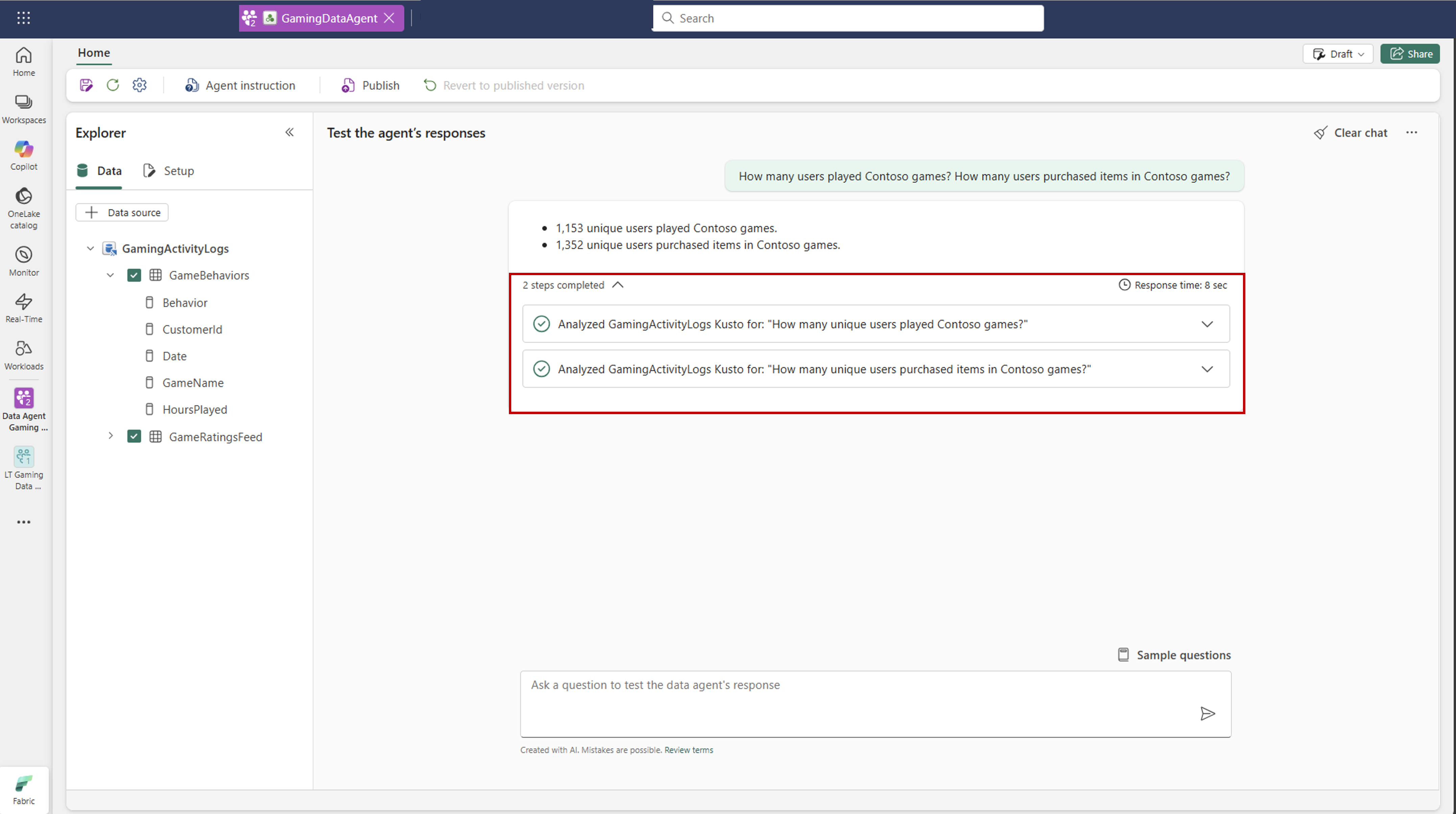 The process is straightforward and you can begin testing the Fabric data agent resources in minutes.