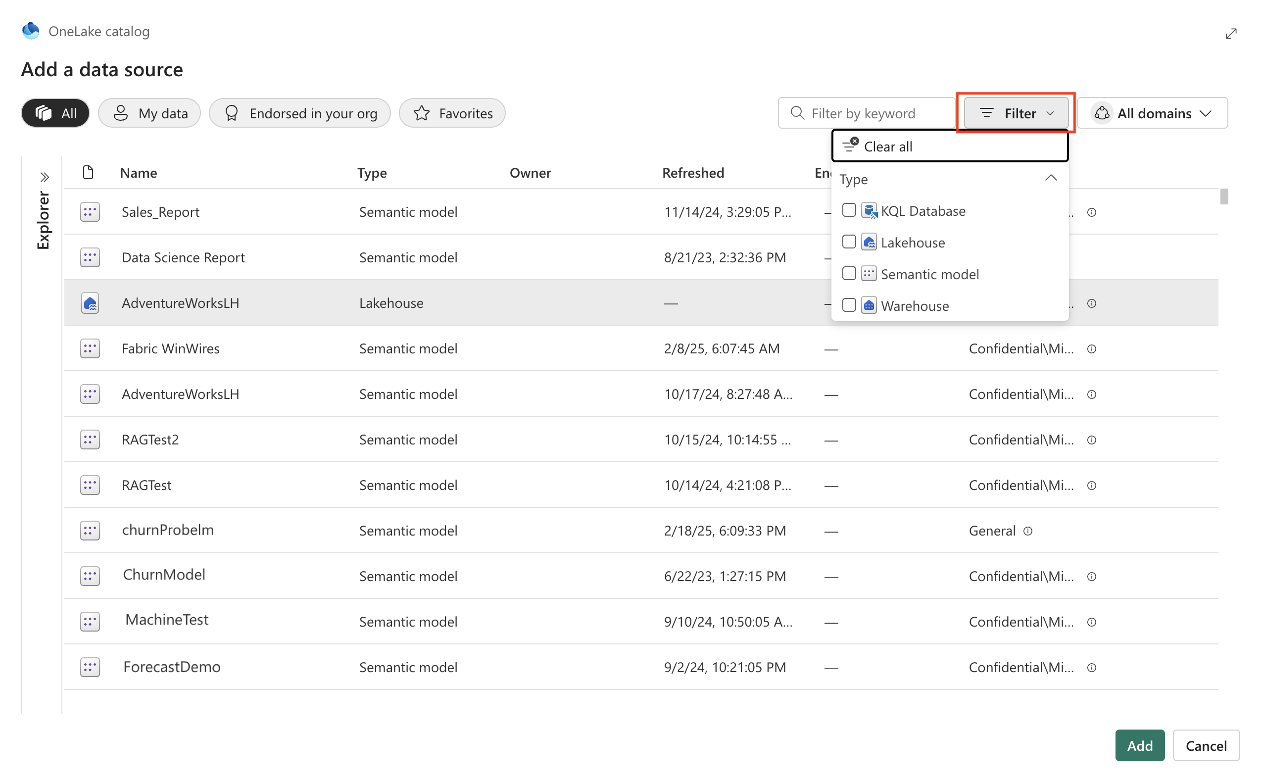 When you create a Fabric data agent for the first time, and provide a name, the OneLake catalog automatically appears, allowing you to add data sources. To add a data source, select it from the catalog as shown on the next screen, then select Add. Each data source must be added individually. For example, you can add a lakehouse, select Add, and then proceed to add another data source. To filter the data source types, select the filter icon and then select the desired type. You can view only the data sources of the selected type, making it easier to locate and connect the appropriate sources for your Fabric data agent.