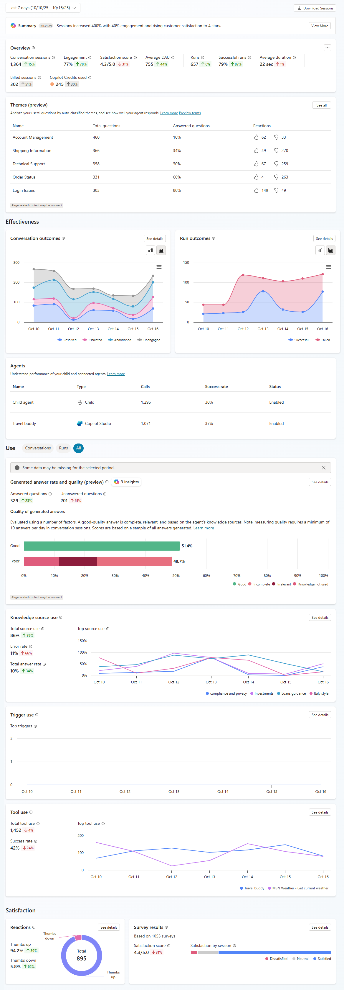 The Analytics page in Copilot Studio shows you comprehensive data for your agent, from an overview of key metrics to in-depth usage analytics for your agent's components. You can drill down into each piece of data to get more details.