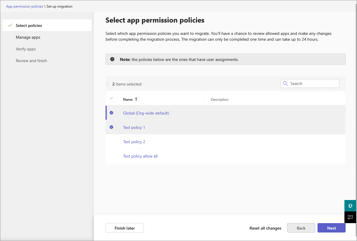 While migrating, you can't make changes to app assignments. The existing UI gets disabled when you start the migration. If you aren't ready to proceed or want to make change to the existing permission policies, open the migration wizard and select the Reset all changes option. You'll lose the progress and can restart the migration later.