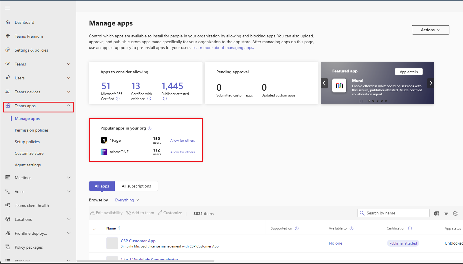 Go to Teams apps > Manage apps to view the Popular apps in your org widget. It shows two of the most-used third-party apps in your organization based on random selection, the number of users using the app, and the Allow for others option.
