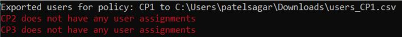 You can also use the following PowerShell command to export user assignments for each custom policy. This script generates an Excel file if the given policy has user assignments; otherwise, a message is shown indicating that no user assignments exist.