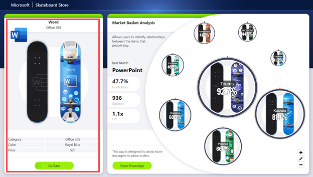 If you select Market Basket Analysis in the tooltip, you drill through to the Market Basket Analysis page, filtered to Word and any other filters on the source data point.