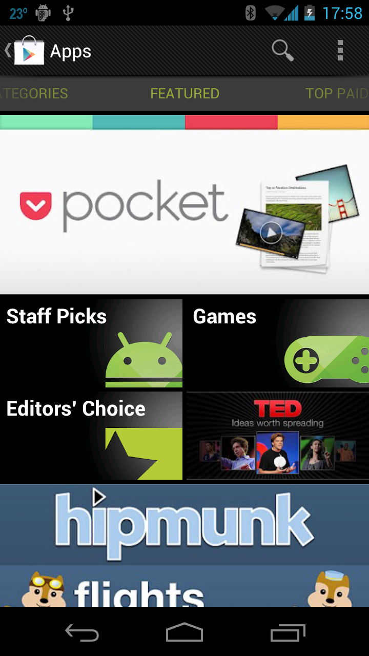 Google Play is arguably the most comprehensive and popular marketplace for Android applications. Google Play allows users to discover, download, rate, and pay for applications by clicking a single icon either on their device or on their computer. Google Play also provides tools to assist in the analysis of sales and market trends and to control which devices and users may download an application. A screenshot of Google Play running on an Android device appears below: