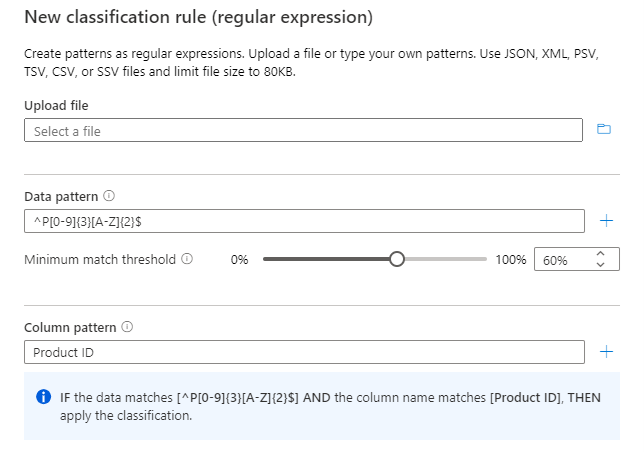 Configure the Minimum match threshold parameter that's acceptable for your data that matches the data pattern to apply the classification. The threshold values can be from 1% through 100%. We suggest a value of at least 60% as the threshold to avoid false positives. However, you could configure as necessary for your specific classification scenarios. For example, your threshold might be as low as 1% if you want to detect and apply a classification for any value in the data if it matches the pattern.