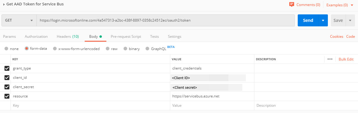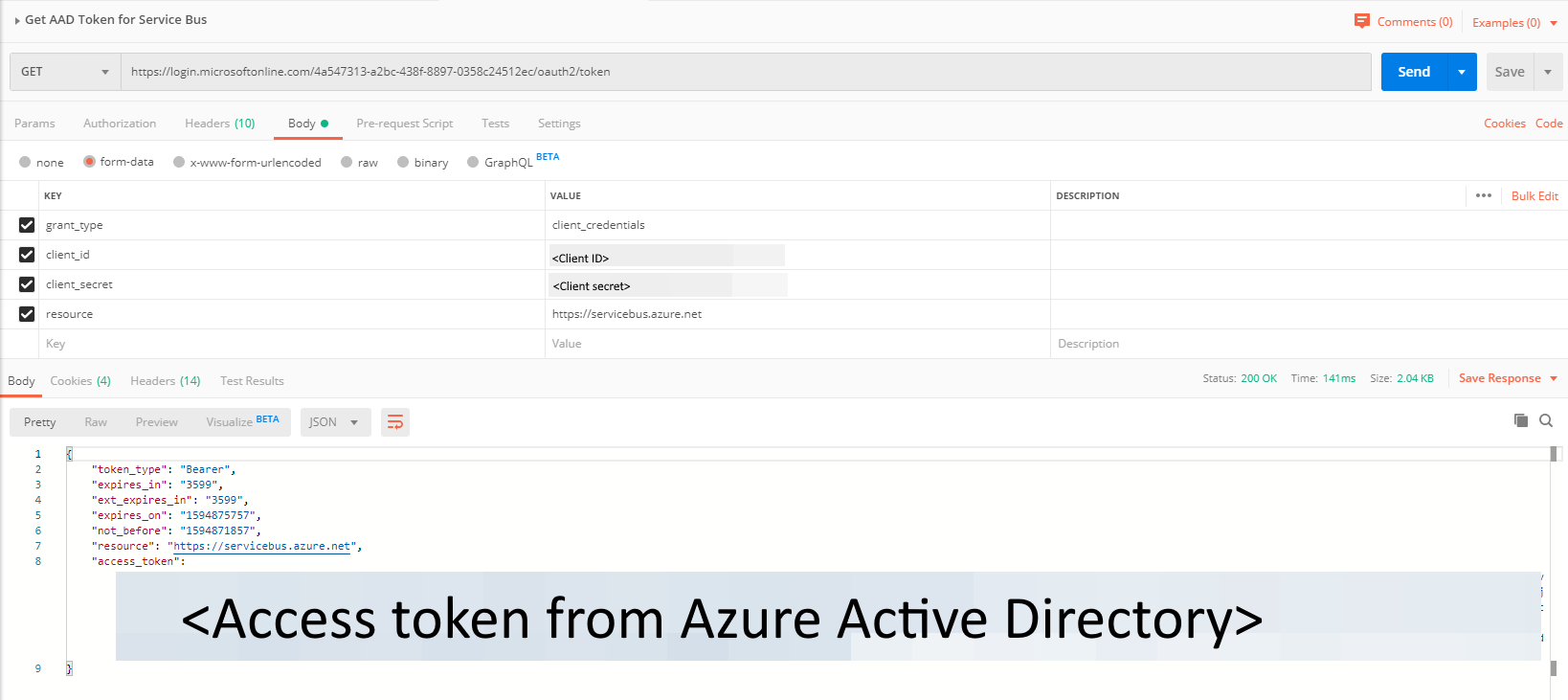 This article gives you an example of getting an Azure AD token that you can use to send messages to a Service Bus namespace. It uses the Postman tool for testing purposes.