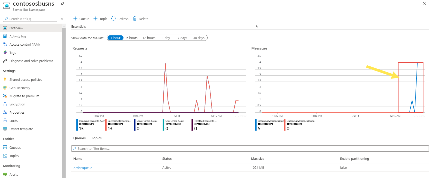 Createdwith the code 201 as shown in the following image.On the namespace page in the Azure portal, you can see that the messages are posted to the queue.